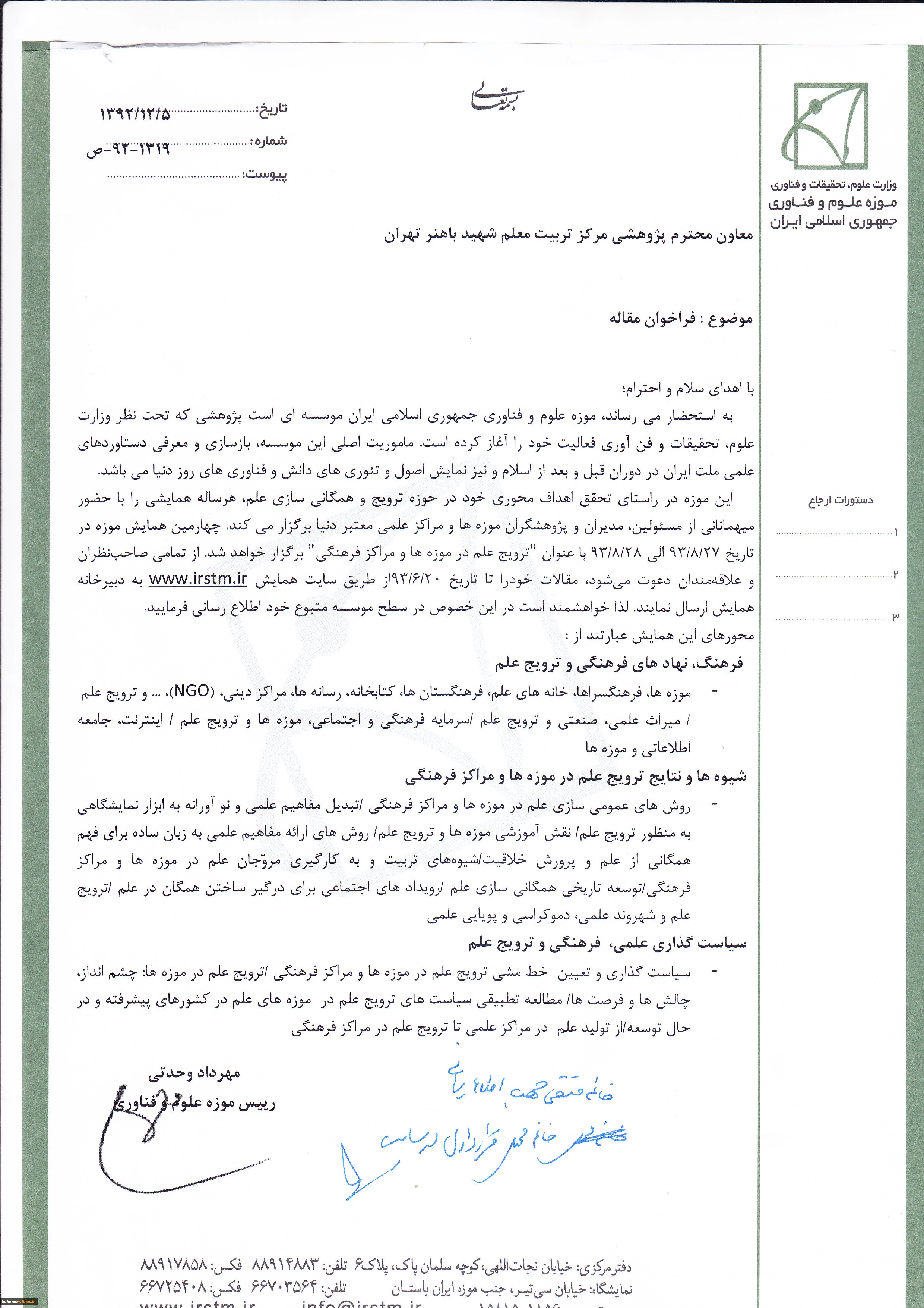 امتیاز دهید : چهارمین همایش موزه علوم و فناوری – ترویج علم در موزه ها و مراکز فرهنگی 3 دوشنبه 26 اسفند 1392 ساعت 13:25