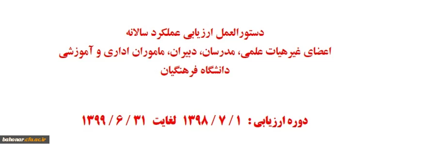 مرکز نظارت و ارزیابی دانشگاه فرهنگیان منتشر کرد: دستورالعمل ارزیابی عملکرد سالانه اعضای غیرهیات علمی، مدرسان، دبیران، ماموران اداری و آموزشی 2