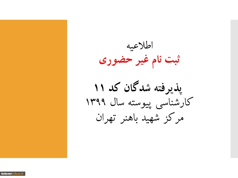 اطلاعیه زمان ثبت نام غیر حضوری پذیرفته شدگان کد 11 کارشناسی پیوسته سال 1399 مرکز شهید باهنر تهران 2