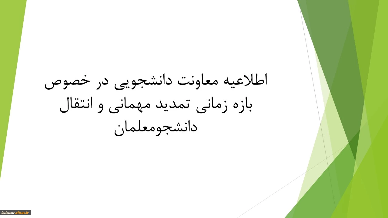 امتیاز دهید : اطلاعیه معاونت دانشجویی در خصوص بازه زمانی تمدید مهمانی و انتقال دانشجومعلمان 2 سهشنبه 30 دی 1399 ساعت 10:03