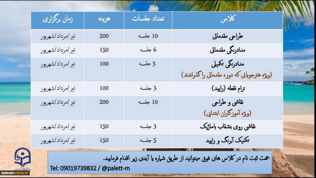 امتیاز دهید : اطلاعیه: کلاس های آموزشی هنرهای تجسمی ترم تابستانه دانشجو معلمان 2 چهارشنبه 16 تیر 1400 ساعت 15:14