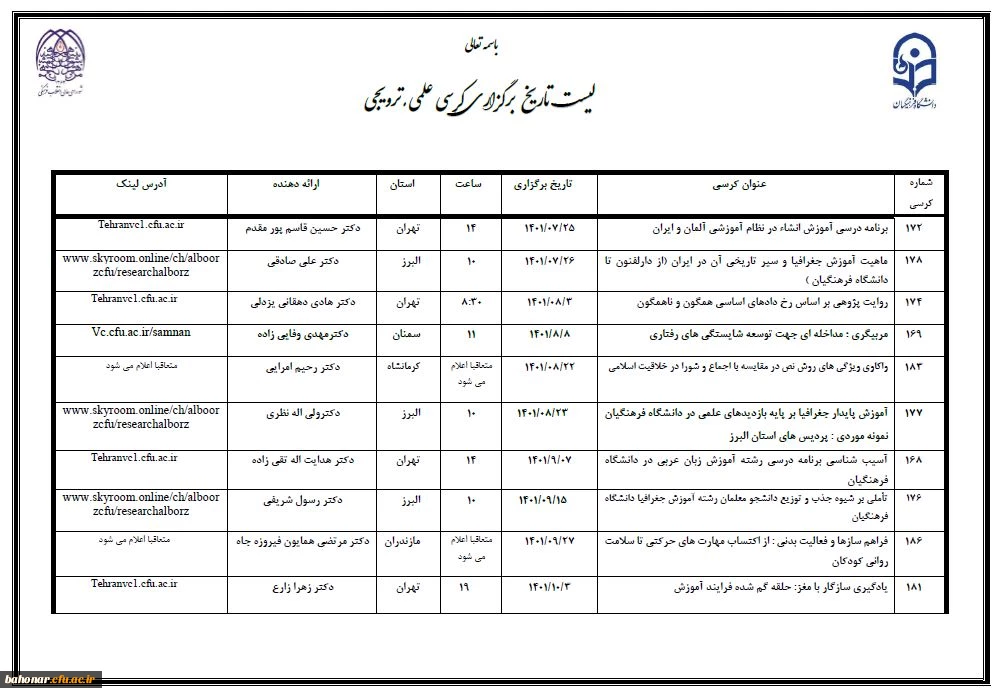 امتیاز دهید : فهرست زمان برگزاری کرسی های ترویجی در دانشگاه فرهنگیان در سال 1401 3 شنبه 30 مهر 1401 ساعت 13:00