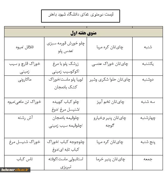 لیست دومنوی غذای مرکز باهنر (منوی هفته اول و دوم ) 2