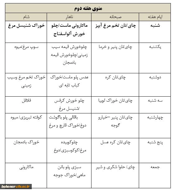 لیست دومنوی غذای مرکز باهنر (منوی هفته اول و دوم ) 3