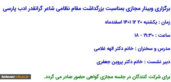 امتیاز دهید : برگزاری وبینار بمناسبت بزرگداشت مقام نظامی شاعر گرانقدر ادب پارسی 2 جمعه 19 اسفند 1401 ساعت 15:12