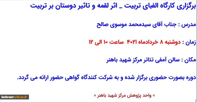 امتیاز دهید : برگزاری کارگاه الفبای تربیت _ اثر لقمه و تاثیر دوستان بر تربیت 2 دوشنبه 8 خرداد 1402 ساعت 7:55