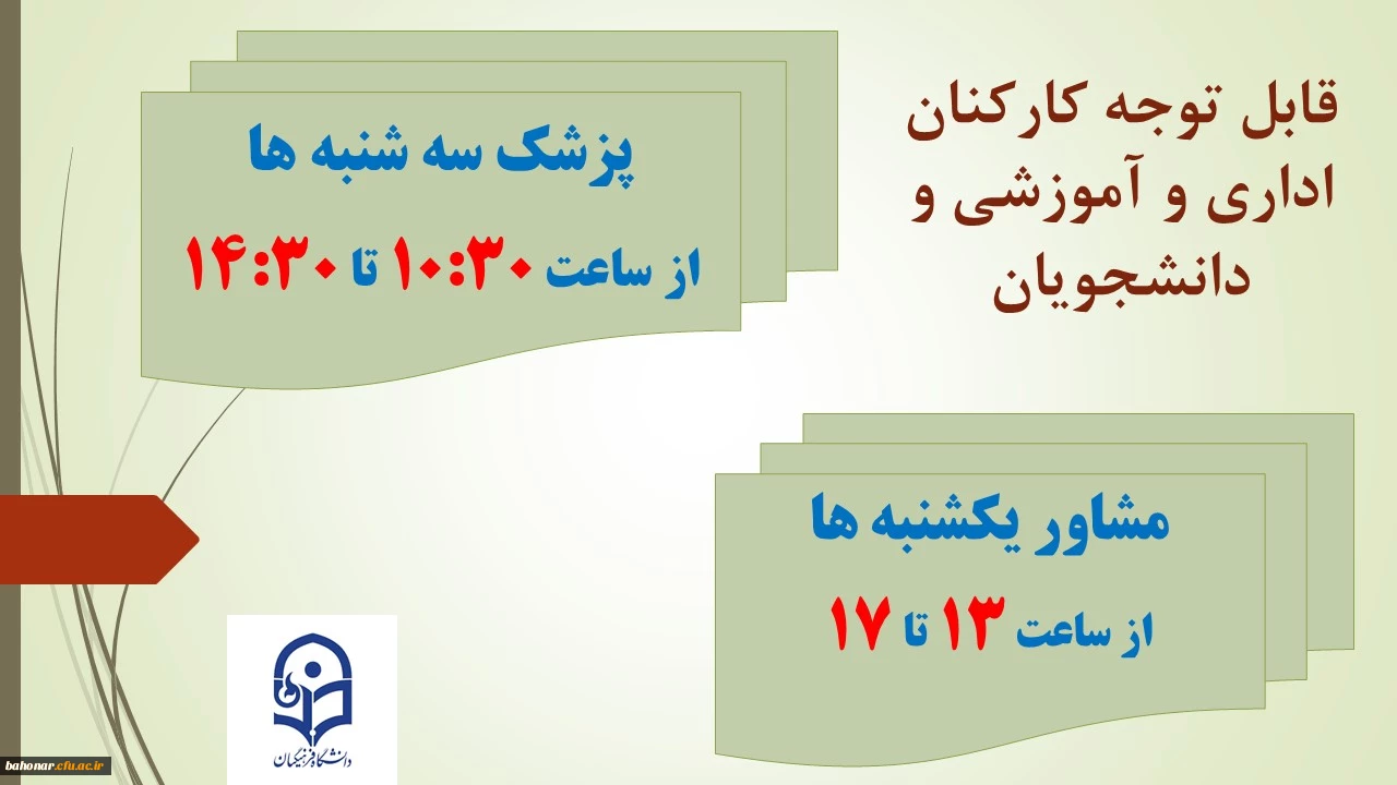 برنامه زمان بندی حضور پزشک عمومی و مشاور در مرکز شهید باهنر 3